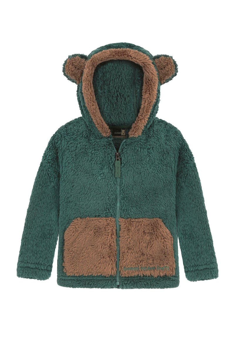 Fleece-Hoodie in Blaugrün mit braunen Akzenten. Verfügt über einen Reißverschluss vorn, zwei Fronttaschen und Bärenohren an der Kapuze. Weiche, strukturierte Oberfläche.
