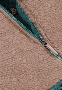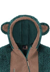 Türkisfarbener Fleece-Einteiler mit strukturierter, lockiger Oberfläche, Kapuze mit Bärchenohren und hellbraunen Akzenten an Bündchen und Füßen.