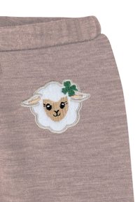 Hellbraune Leggings aus einem weichen, elastischen Stoff. Mit einem Schafdesign und einem grünen Akzent auf dem linken Oberschenkel. Eng anliegende Fußabschlüsse.