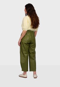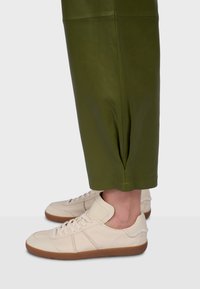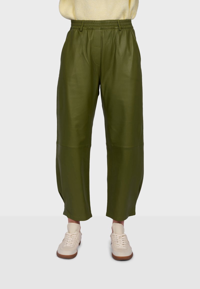 Olivgrüne, hochtaillierte Hosen mit weitem Bein und elastischem Bund, kombiniert mit beigen Sneakers und einem leichten Pullover, vor schlichtem Hintergrund.