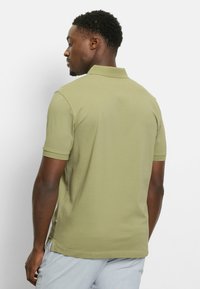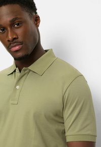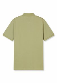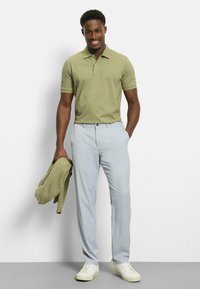 Mann trägt ein hellgrünes Polo-Shirt mit kurzen Ärmeln und eine hellgraue Hose, steht mit einer Hand in der Tasche vor einem einfarbigen Hintergrund.