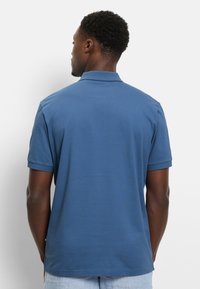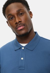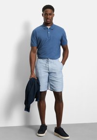 Mann trägt ein blaues kurzärmeliges Poloshirt und hellblaue Hose mit Kordelzug, steht vor einem schlichten weißen Hintergrund.