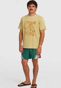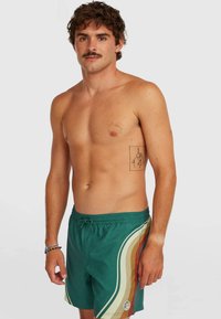 Grüne Badeshorts mit elastischem Bund und Kordelzug. Verfügt über horizontale Streifen in Beige, Braun und Rost. O'Neill-Logo-Patch am Bein.