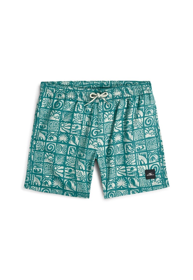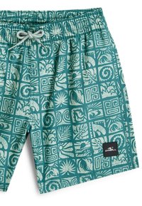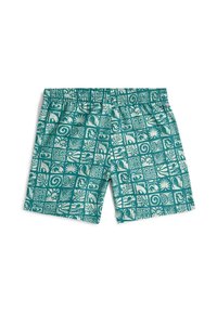 Türkisfarbene Badeshorts mit weißen tropischen und geometrischen Mustern, elastischem Bund, Kordelzug und schwarzem Markenzeichen auf dem linken Bein.