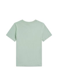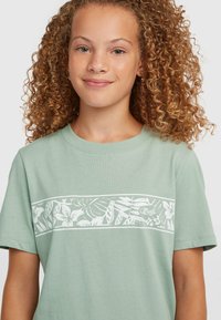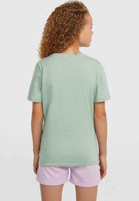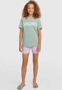 Hellgrünes T-Shirt mit kurzen Ärmeln und weißem Blumenmuster, kombiniert mit lila Shorts und grünen Flip-Flops. Glatte Stoffstruktur.
