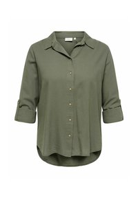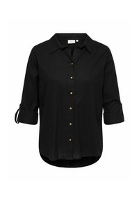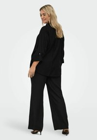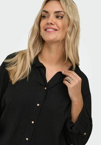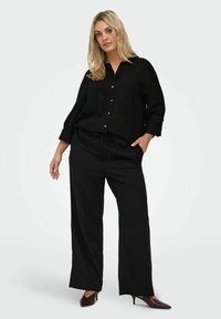 Lächelnde blonde Frau, die ein schwarzes Hemd mit hochgekrempelten Ärmeln und schwarze Hose trägt, eine Hand in der Tasche, vor einem schlichten Hintergrund.