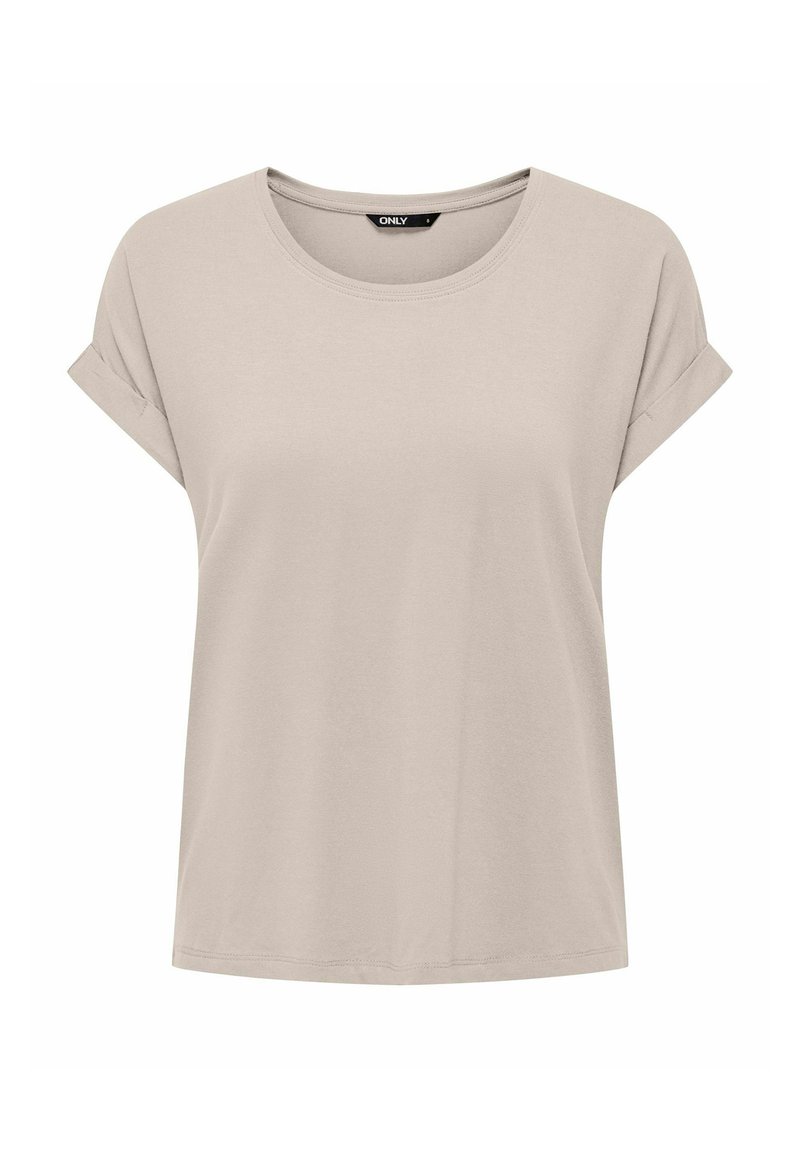Beige T-Shirt mit kurzen Ärmeln und aufgerollten Bündchen, Rundhalsausschnitt und geradem Saum, innen am Kragen mit dem Label "ONLY" versehen.