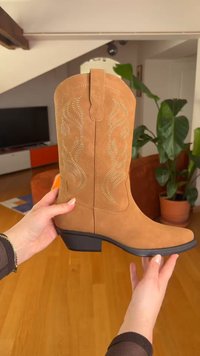 Hellbrauner Wildleder-Cowboy-Stiefel mit spitz zulaufender Spitze, dekorativer Stickerei in wirbelndem Muster, mittelhohem Absatz und Zuglasche für einfaches An- und Ausziehen.