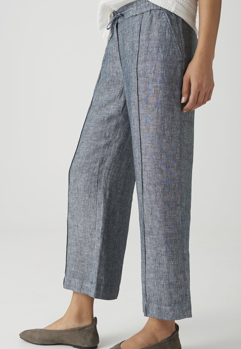 Frau trägt graue Leinenhose mit Kordelzug und Seitentaschen sowie graue flache Schuhe, gezeigt von der Mitte des Oberschenkels bis zu den Füßen vor einfachem Hintergrund.