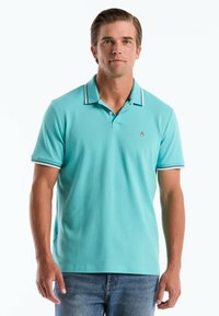 Cremfarbendes Poloshirt mit Kragen, das einen marineblauen und weißen gestreiften Akzent am Kragen und an den Ärmeln aufweist. Enthält ein kleines Pinguin-Logo.