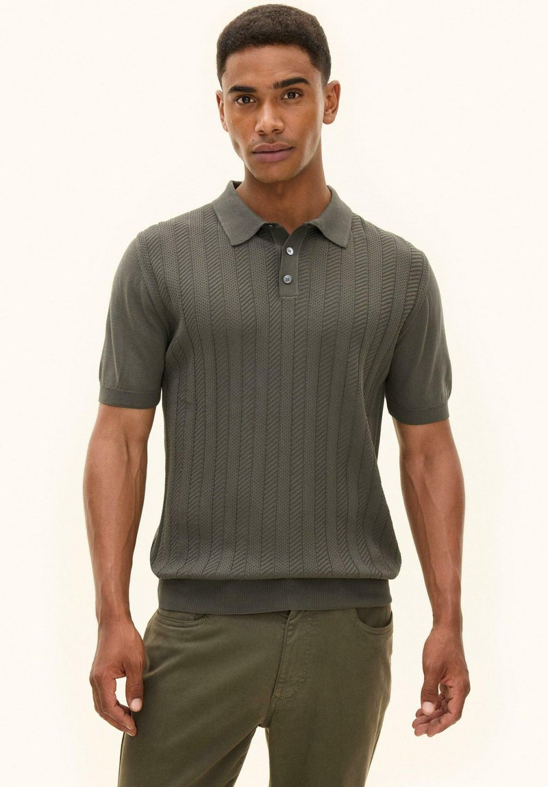 Mann trägt ein olivgrünes, kurzärmeliges Strick-Poloshirt mit strukturierten vertikalen Streifen und passende olivgrüne Hose.