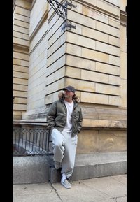 • Graue Jogginghose mit elastischem Bund und seitlichen Streifen, kombiniert mit schwarz-weißen Vans-Sneakern im Schachbrettmuster. Dazu eine bomberjacke in erdigen Tönen.