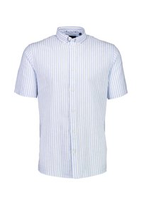 • Helles blaues Leinenhemd mit einem Button-Down-Kragen und zwei vorderen Knöpfen. Der Stoff ist leicht strukturiert und hat eine natürliche, atmungsaktive Optik.
