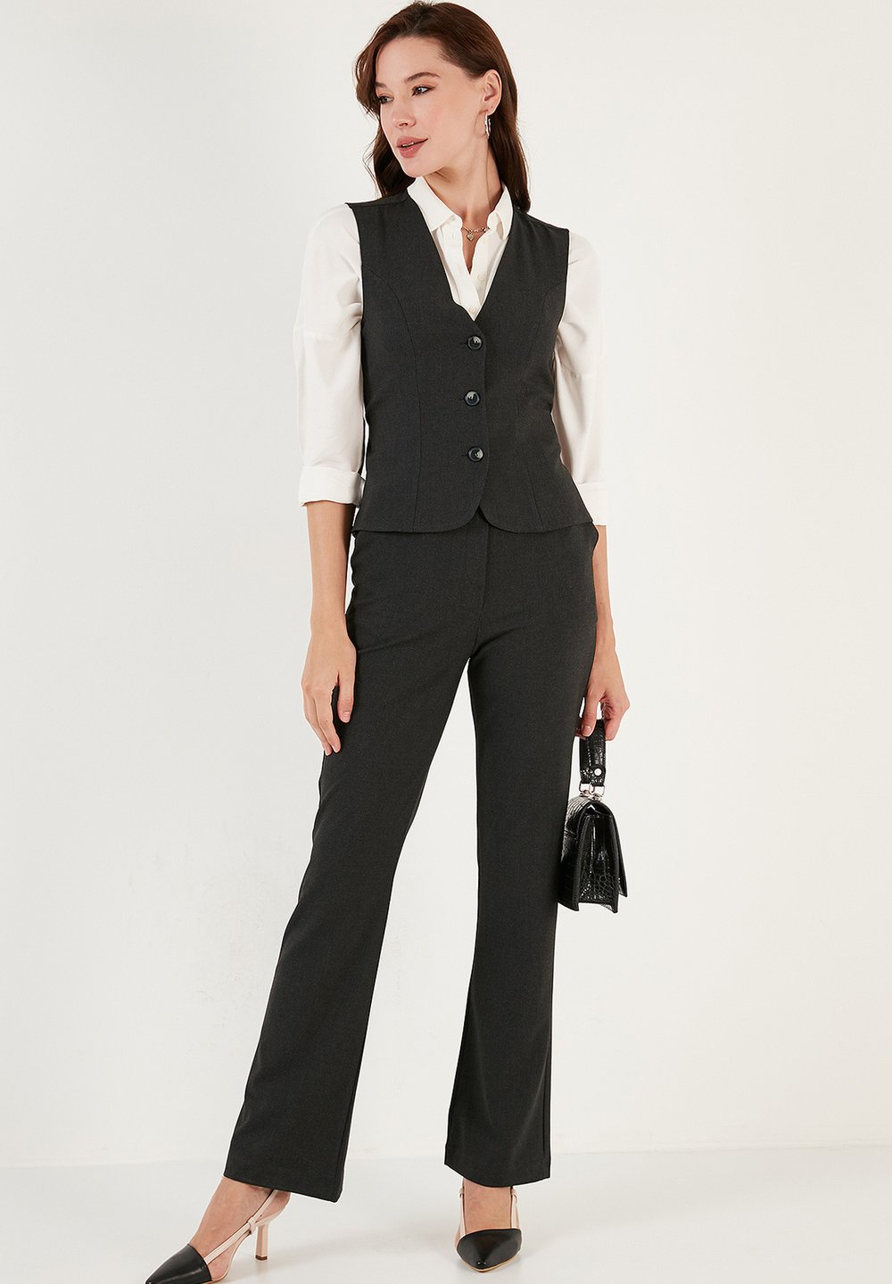 Marineblau gestreifter Weste mit V-Ausschnitt, gelbe weite Hose und blaue Schuhe. Holzvertäfelter Hintergrund mit kunstvollen Details.