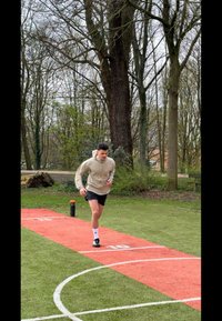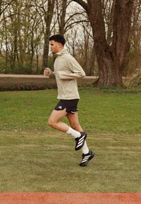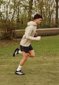 • Junger Mann joggt im Freien auf Gras, trägt eine beige Jacke, schwarze Shorts, weiße Socken und schwarze Laufschuhe mit weißen Streifen.