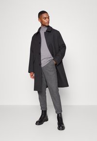 Schwarze Lederjacke, weißer Strickpullover mit Zopfmuster und Rollkragen, graue Anzughose und schwarze Schuhe; stehend auf einer Treppe vor einem Betongrund.