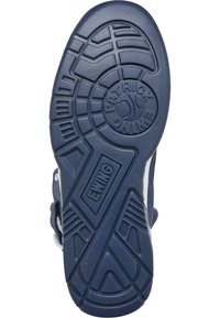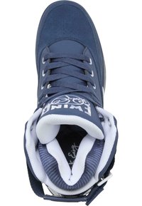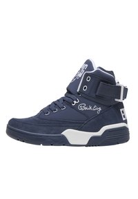 Marineblauer High-Top-Sneaker mit weißen Akzenten, Schnürsenkeln, Knöchelriemen und dicker Sohle, von der Seite auf weißem Hintergrund gezeigt.