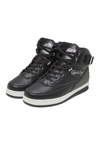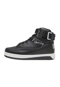 Schwarzer High-Top-Sneaker mit weißer Sohle, vorne Schnürsenkel, Knöchelriemen und Branding an Ferse und Rückseite.