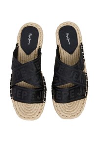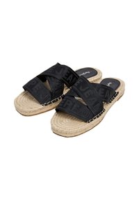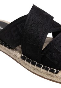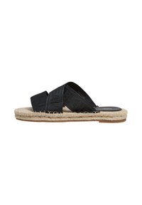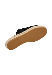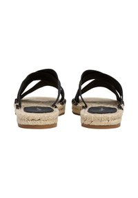 Schwarze Espadrille-Pantoffel mit gekreuzten Stoffriemen und juteumwickelter Sohle vor weißem Hintergrund.