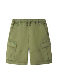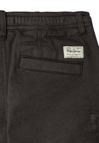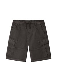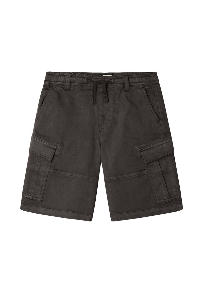 Schwarze Cargo-Shorts mit elastischem Bund, Kordelzug, seitlichen Klappentaschen und schrägen Fronttaschen, aus robustem Stoff gefertigt.