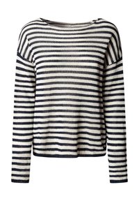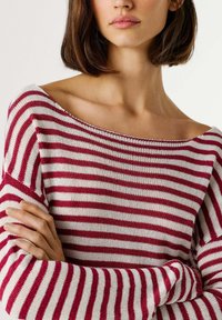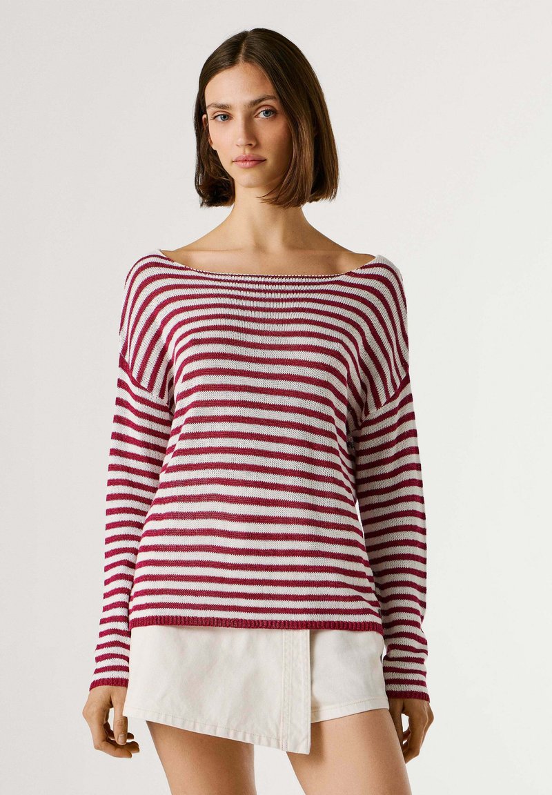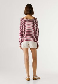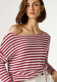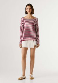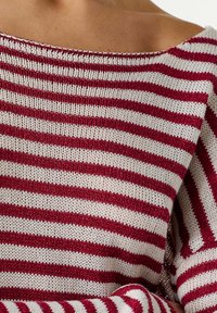 Junge Frau trägt einen rot-weiß gestreiften schulterfreien Pullover und einen asymmetrischen weißen Rock vor neutralem Hintergrund.