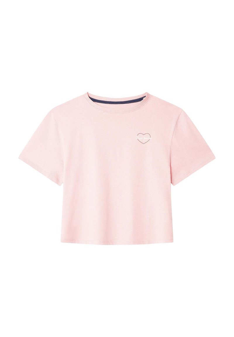Rosa kurz geschnittenes T-Shirt aus weicher Baumwolle. Es verfügt über kurze Ärmel, einen Rundhalsausschnitt und ein kleines Herz-Detail auf der linken Brust.