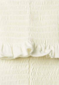 Elfenbeinfarbener Oberteil mit strukturiertem, gerafftem Stoff, kurz geschnittenen, weiten Ärmeln und einem Rüschensaum. Enthält ein kleines Logoetikett an der Seite.
