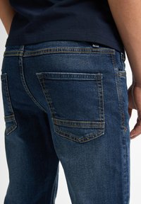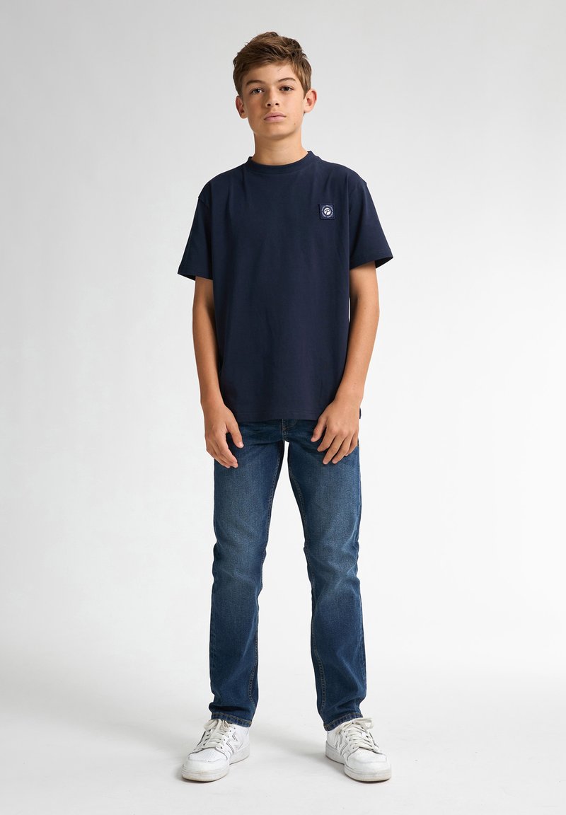 Teenager-Junge steht, trägt ein dunkelblaues T-Shirt mit kleinem Logo, blaue Jeans und weiße Sneakers vor einem schlichten hellen Hintergrund.