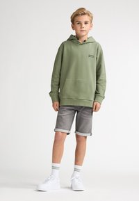 Olivgrüner Hoodie mit Fronttasche und schwarzem Logo, kombiniert mit grauen Jeansshorts mit umgeschlagenen Säumen. Weiße Turnschuhe und gestreifte Socken.