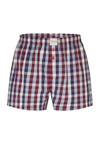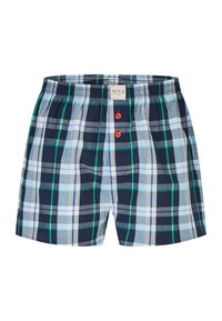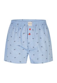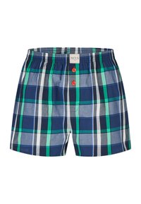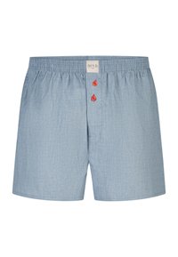 Sechs Paar Herrenboxershorts in verschiedenen Mustern, darunter Karo, einfarbig hellblau und kleine Druckdesigns, jeweils mit roten Knöpfen am Verschluss.