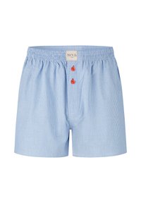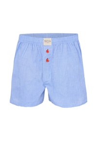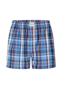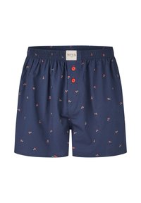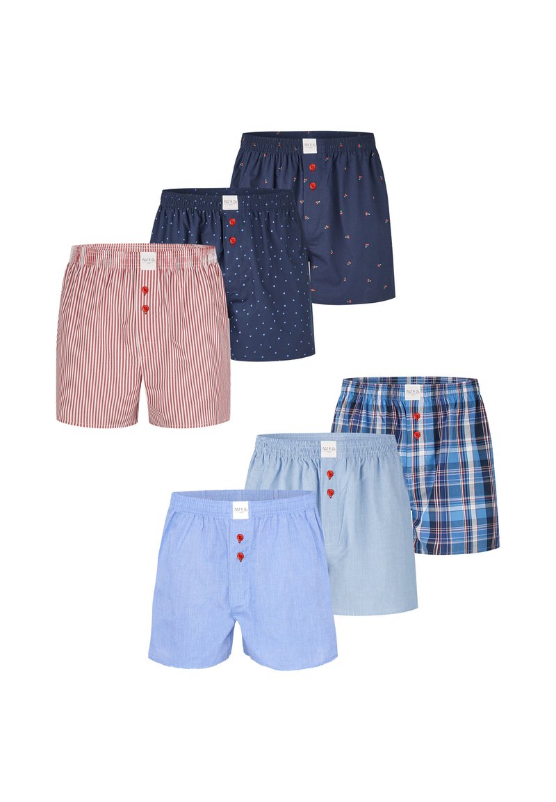 Sechs Herrenboxershorts mit elastischem Bund und roten Knöpfen, mit Streifen-, Polka-Dot-, Blumen-, Uni- und karierten Mustern in Blau- und Rottönen.