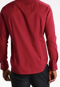 Mann trägt ein eng anliegendes rotes Hemd mit langen Ärmeln und Knöpfen, kombiniert mit dunkelgrauen, maßgeschneiderten Hosen, steht mit entspannten Armen.