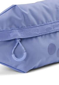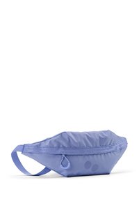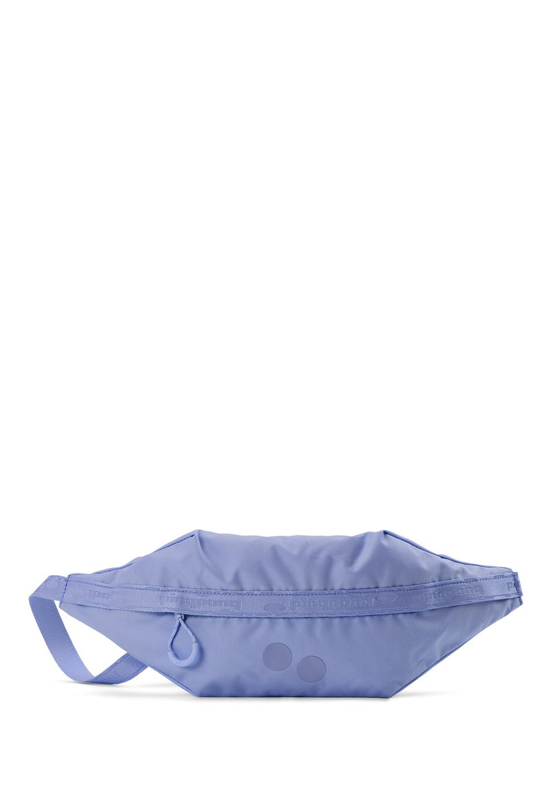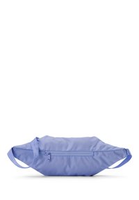 Hellblauer Nylon-Taillentasche in abgerundeter Form, mit verstellbarem Riemen und zwei erhabenen runden Akzenten auf der Vorderseite. Glatte Textur.