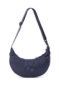 Schwarze Schultertasche aus weichem Stoff, gebogene Form, mit zwei runden Akzenten. Das Modell trägt einen burgunderfarbenen Reißverschluss-Oberteil und schwarze Hose.