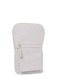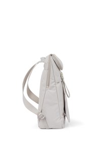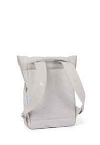 Hellgrauer Rucksack mit einem umklappbaren Deckel, einem Reißverschluss-Frontfach, glatter Textur und zwei kleinen runden Akzenten in Weiß und Hellblau.