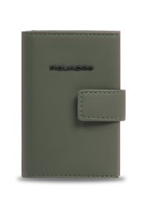 Hellbraune Lederbrieftasche mit Druckknopfverschluss und schwarzem in der Mitte vorn eingeprägtem Piquadro-Logo.
