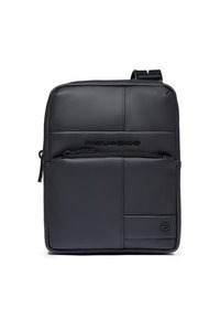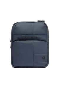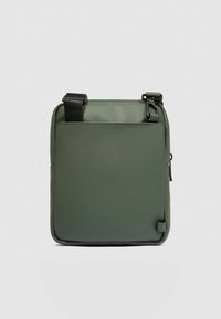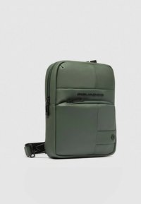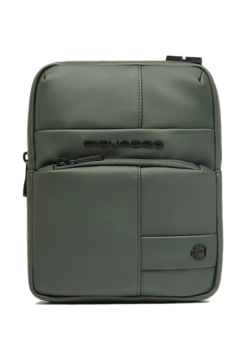 Kompakte, olivgrüne Umhängetasche mit vorderer Reißverschlusstasche, abgesteppten Paneelen und geprägt Piquadro-Logo in der oberen Mitte.
