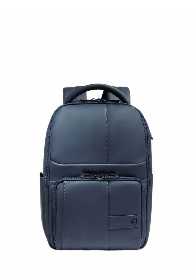 Kompakter marineblauer Rucksack mit frontaler Reißverschlusstasche, gepolstertem Griff und glattem synthetischem Material.