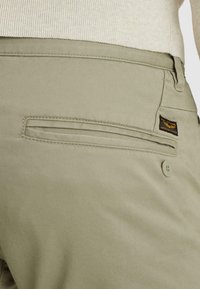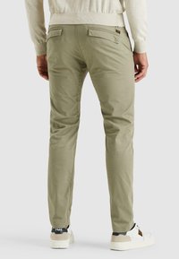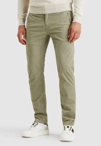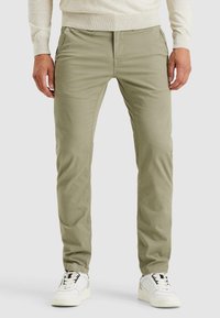 Mann trägt schlanke beige Hose, weiße Sneakers und einen hellbeigen Pullover, steht mit entspannten Händen an den Seiten.