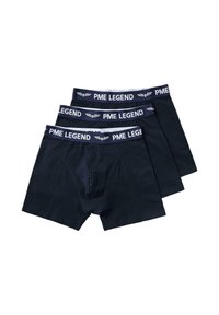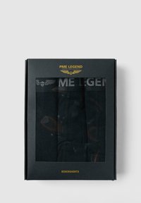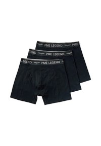 Drei gestapelte schwarze Boxershorts für Herren, jeweils mit einem grauen elastischen Bund, der den Schriftzug "PME LEGEND" und ein geflügeltes Emblem zeigt.