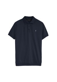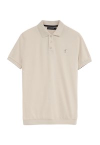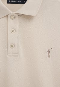 Beiges Polohemd mit kurzen Ärmeln, Kragen, drei Knöpfen und kleinem Polo-Spieler-Logo auf der linken Brust.