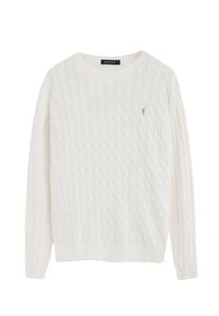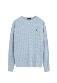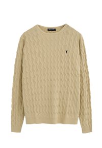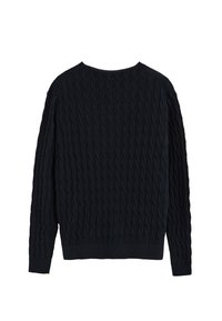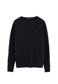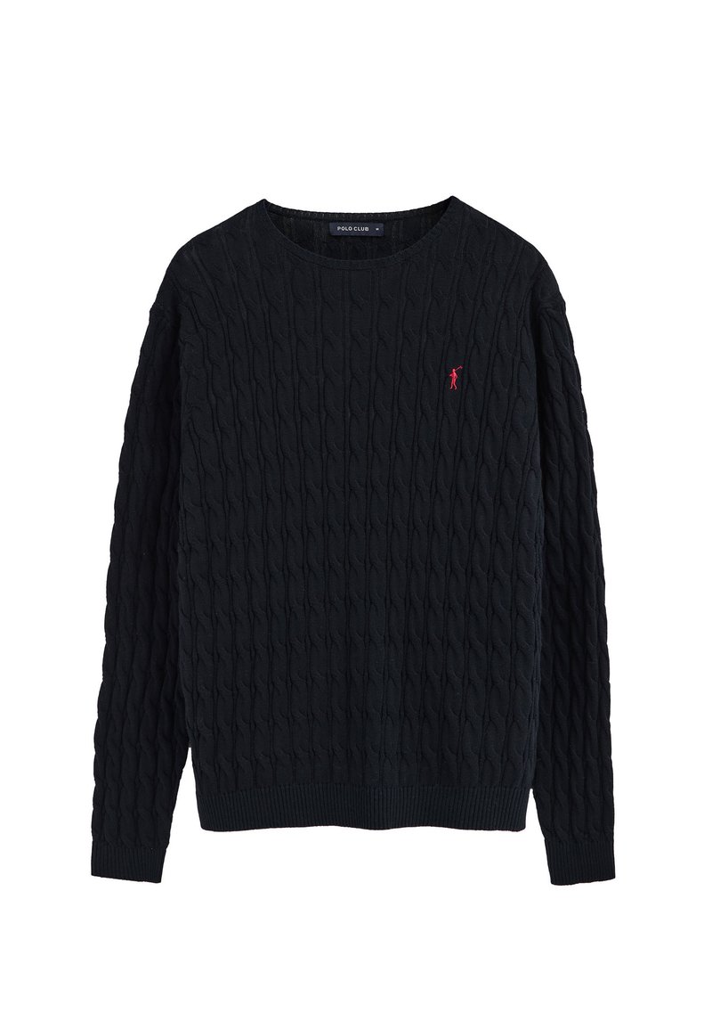 Schwarzer, langärmliger Pullover mit Kabelstrickmuster, rundem Ausschnitt und kleinem, rot besticktem Polo-Spieler-Logo auf der linken Brust.