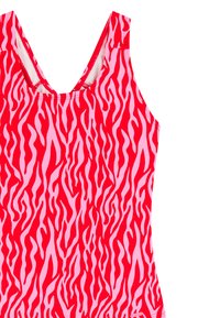 Roter und pink gestreifter Einteiler mit Zebramuster, breiten Schulterträgern und rundem Ausschnitt, dargestellt vor weißem Hintergrund.