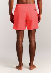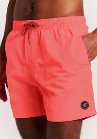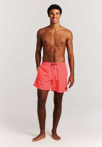 Mann steht barfuß in korallenroten Badeshorts mit schwarzem Kordelzug und kleinem rundem schwarzem Logo am linken Bein vor weißem Hintergrund.
