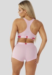 Frau mit langen blonden Haaren, die einen pinkfarbenen Sport-BH und passende Shorts mit rotem "PSD"-Logo auf den elastischen Bändern vor einem grauen Hintergrund trägt.