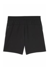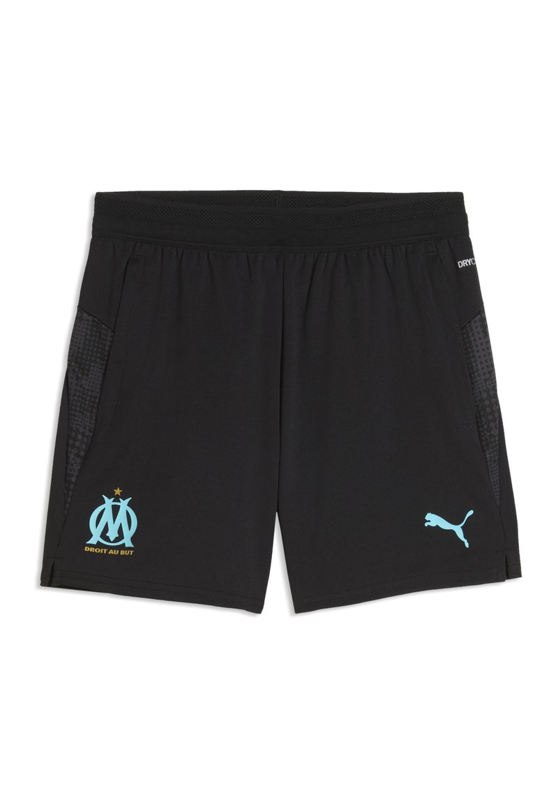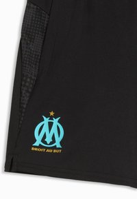 Schwarze Sportshorts mit blauem Puma-Logo am rechten Bein und Emblem des Fußballclubs Marseille mit dem Text "Droit au but" am linken Bein.