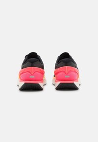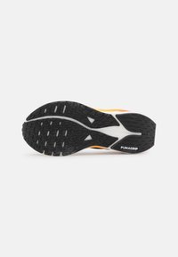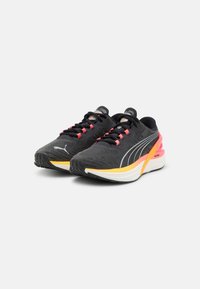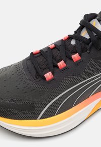Schwarzer und pinker Laufschuh mit weißer und oranger Sohle, gebrandet mit "Nitro" und Puma-Logo, für sportliche Nutzung entworfen, Seitenansicht.