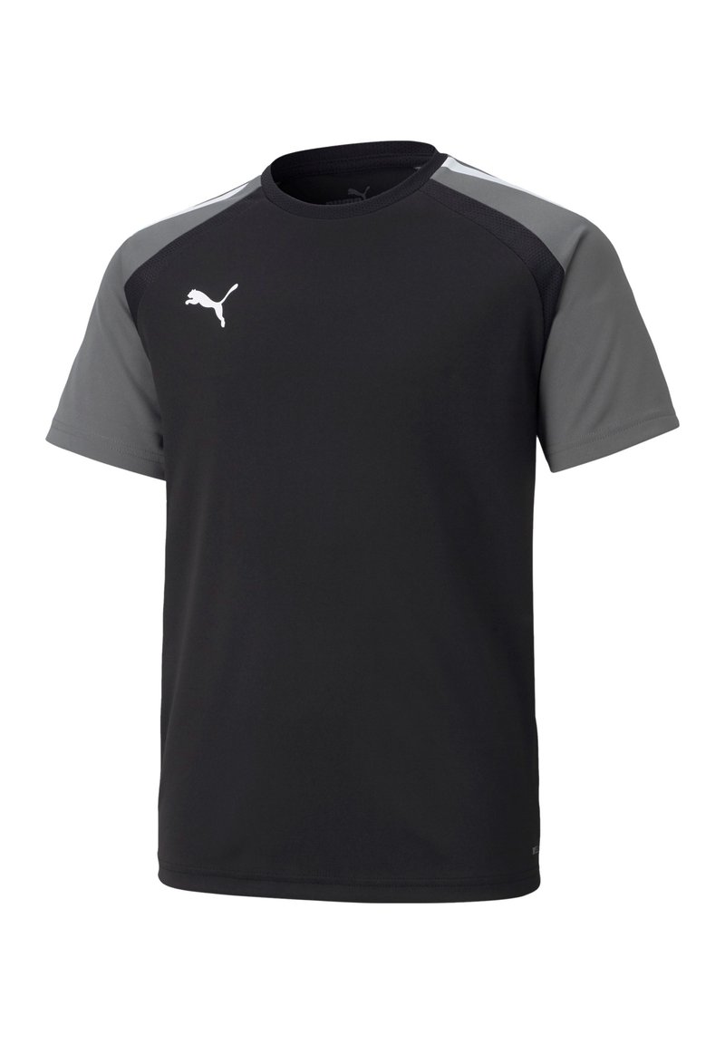 Schwarzes Sport-T-Shirt mit kurzen Ärmeln und grauen Akzenten an den Schultern, aus atmungsaktivem Stoff gefertigt, mit einem kleinen weißen Logo auf der Brust.