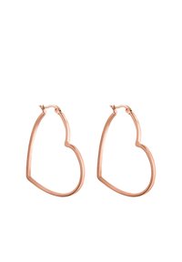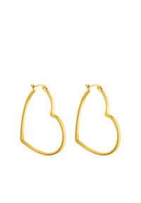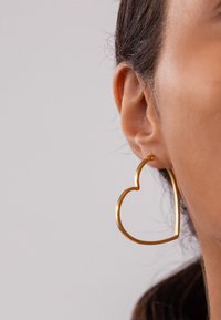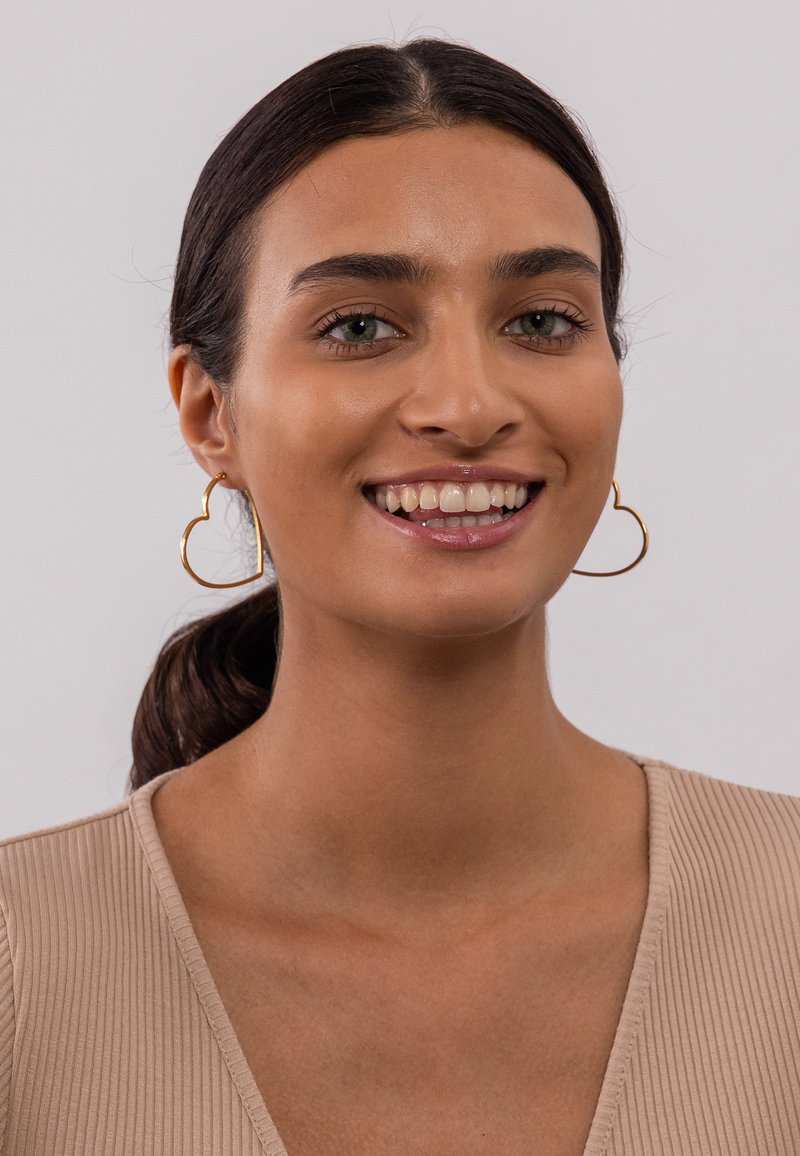 Goldene, herzförmige Creolen mit offenem Design, leicht und mit strukturiertem Detail, getragen von einem Model in einer neutralen Bluse.