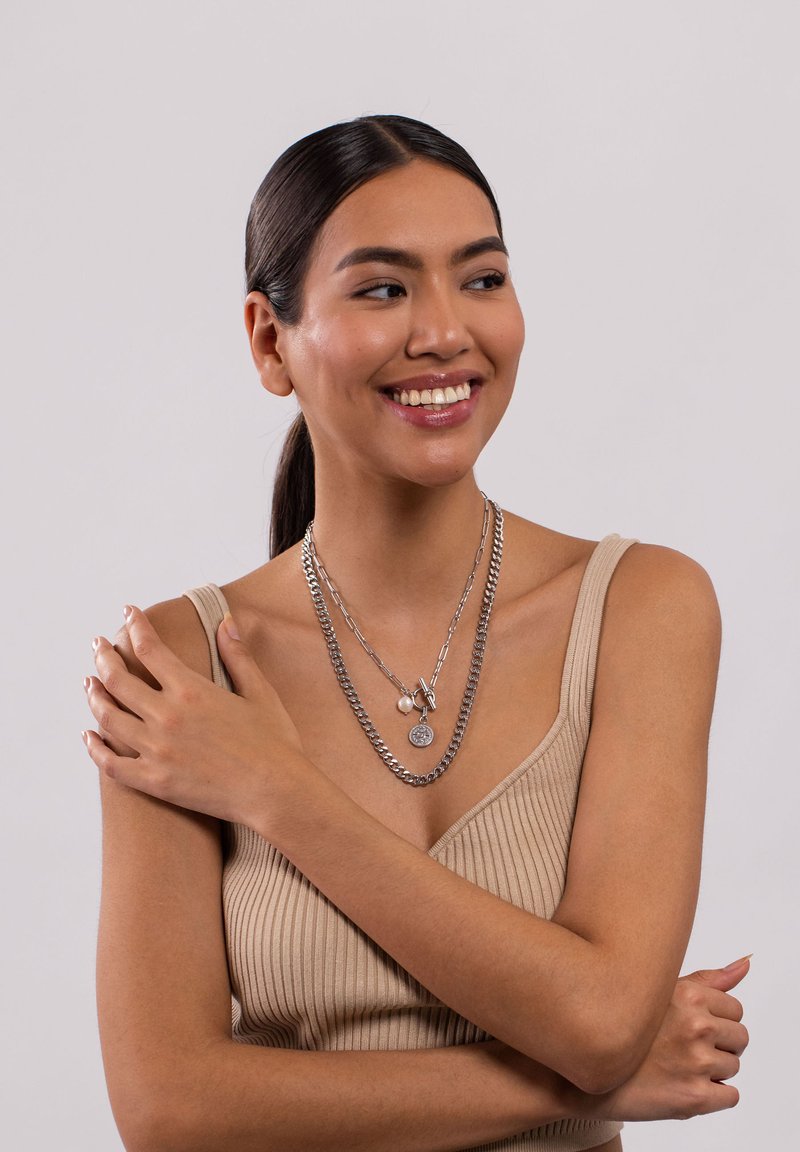 Silberne, geschichtete Halsketten mit Ketten- und Anhängerdetails, getragen von einem Modell mit langen, dunklen Haaren, in einem beigen, gerippten Oberteil vor einem neutralen Hintergrund.